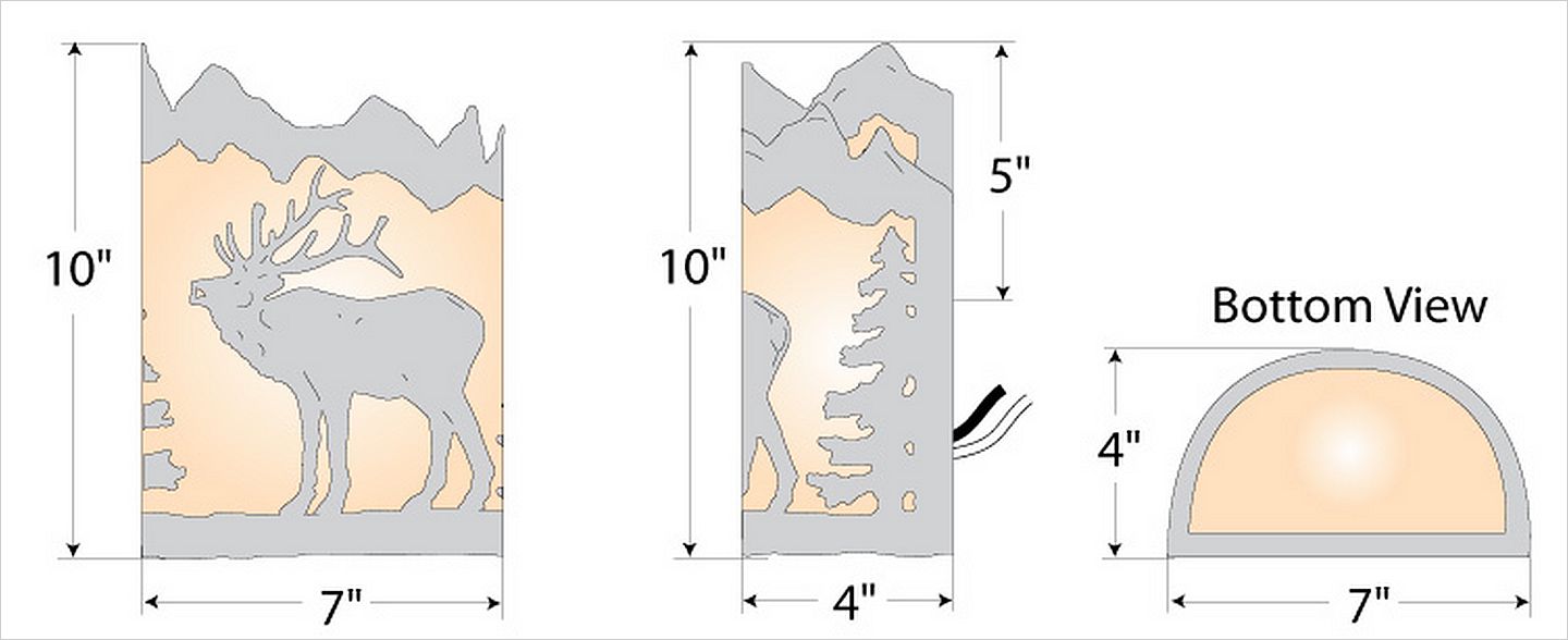 The Cascade Sconce Small - Elk features our exclusive metal art of an elk and spruce trees with a rounded mica under a steel frame. One lightbulb points upward. ADA compliant. Diffuser material is offered with a choice between Almond or Amber mica. Hardwire is standard. Interior and damp location only. This light will add rustic character to any log home, cabin or northwoods lodge-themed room.
