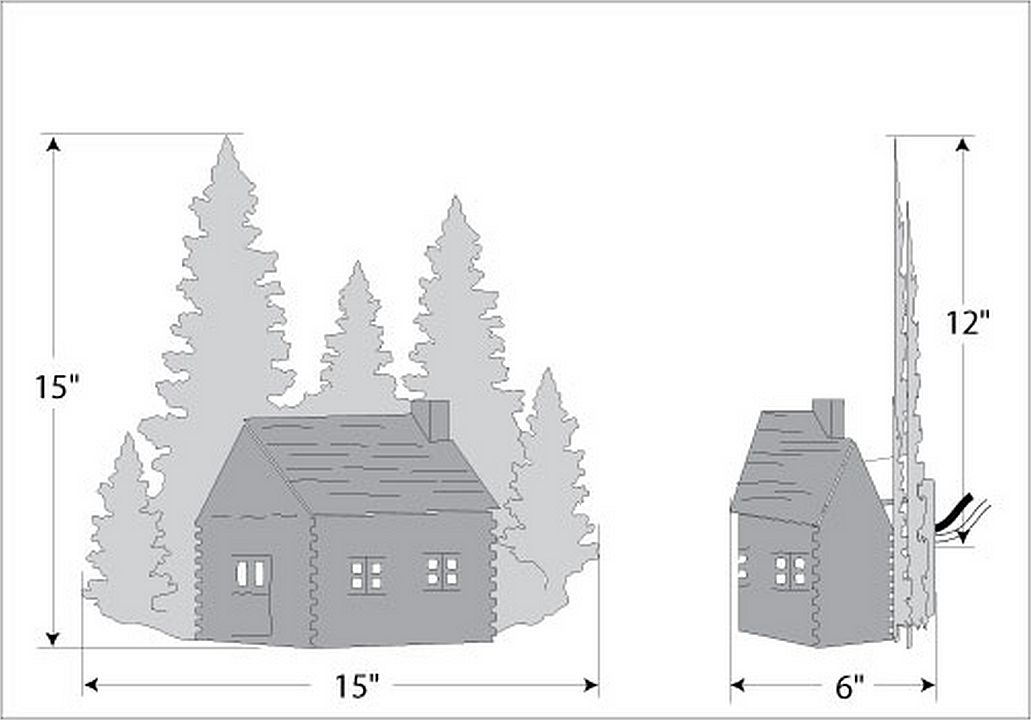 The Cozy Log Cabin sconce features our trademarked steel pine trees set behind the cabin with the medium-based lamping between them. The trees are hand-painted over rust patina finish. Covering the bulb is a frost clear glass diffuser, which shields the bulb from side viewing. The cabin also has an almond mica diffuser on the bottom, which gives the effect of a warm rustic log home lit from within. Suitable for interior and damp locations only. For an exterior version of this light, see the exterior lights section.