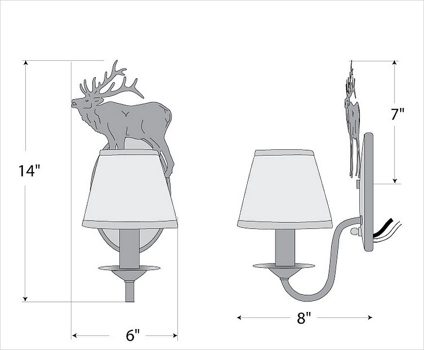 The Diablo Sconce - Mtn Elk features an oval backplate, an on/off switch located on the front of the fixture and a candelabra clip shade. Comes standard with a lampshade, Style #710-KR (3 x 5 x 4). This light is ideal for anyone looking to add warm, rustic lighting to their log home, cabin or northwood lodge-themed room.
