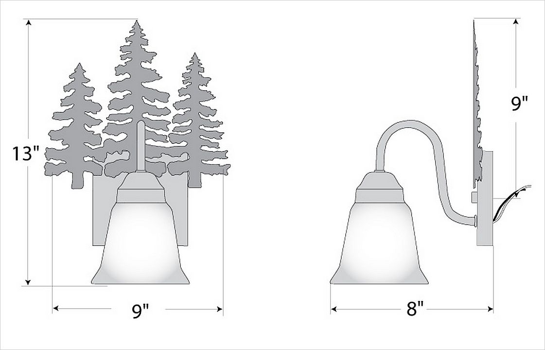 Our Wasatch Single Sconce series is one of most versatile light, as it is often used in the bathroom on either side of the vanity, in the family room on either side of the fireplace, or anywhere where you want a bright light. Offered with a choice of eight different styles and colors of glass globes, this rustic wall fixture is a great choice. This item is the Wasatch Single - Cedar Tree and is Pictured in Finish #03 - Cedar Green trees and Rust Patina base.