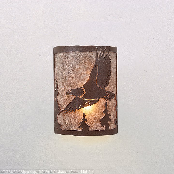 The Cascade Sconce Small - Eagle features our exclusive metal art of a Eagle and trees with rounded diffuser under a steel frame. One lightbulb points upward. ADA compliant. Diffuser material is offered with a choice between Almond or Amber mica. Hardwire is standard. Interior and damp location only. This light will add rustic character to any log home, cabin or northwoods lodge-themed room.