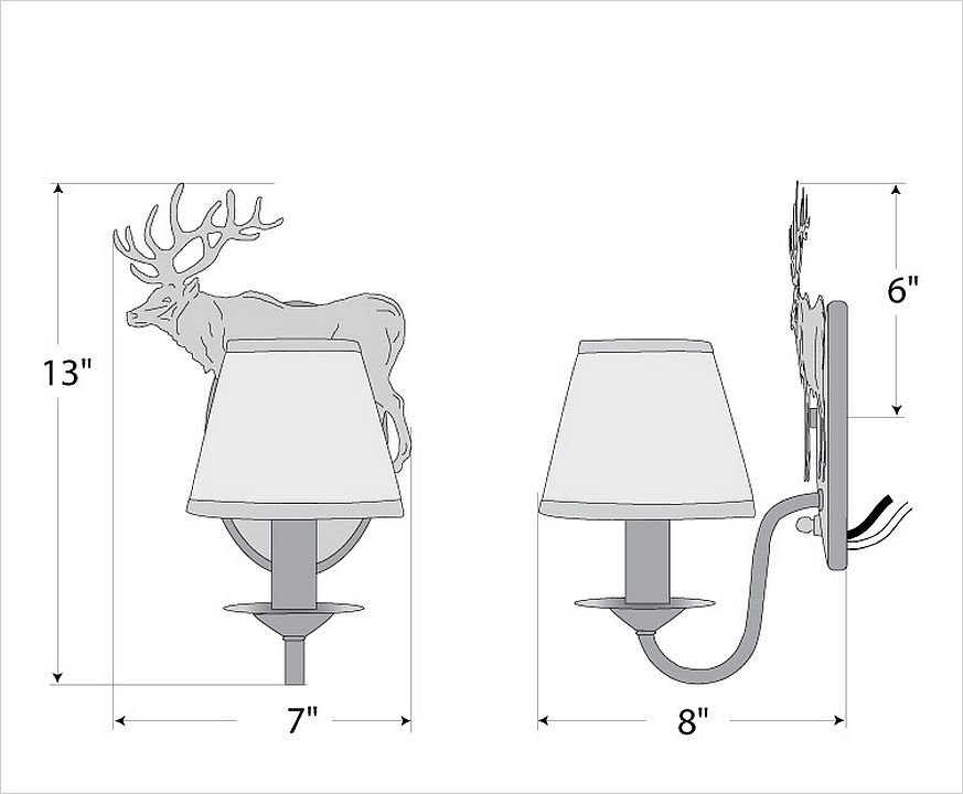 The Diablo Sconce - Valley Elk features an oval backplate, an on/off switch located on the front of the fixture and a candelabra clip shade. Comes standard with a lampshade, Style #710-KR (3 x 5 x 4). This light is ideal for anyone looking to add warm, rustic lighting to their log home, cabin or northwood lodge-themed room.