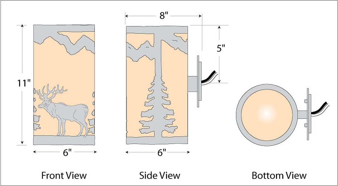 The Kincaid Sconce - Elk features our exclusive metal art of an elk and spruce trees with a rounded mica under a steel cylinder. One lightbulb points upward and the other points downward. This sconce sits off the wall by about 3 inches. Diffuser material is offered with a choice between Almond or Amber mica. Interior and damp location only. This rustic wall light will add rustic character to any log home, cabin or northwoods lodge-themed room.