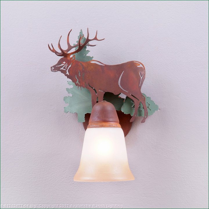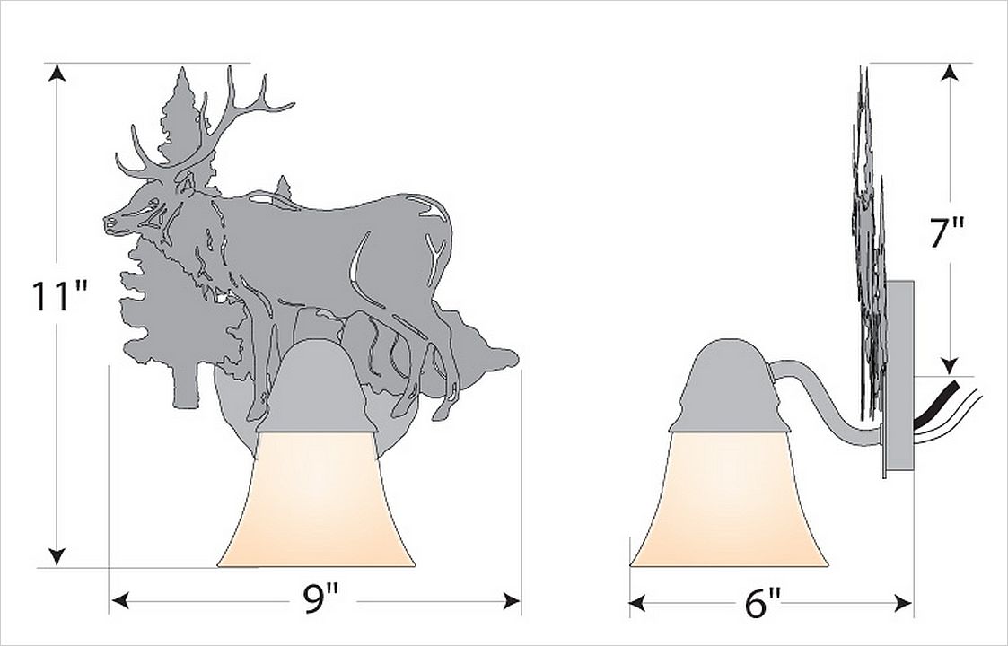 The Lakeside Single Sconce - Elk features our exclusive laser cut elk standing next to our pine trees, all attached to a rustic steel disc with a single arm with light. There is a choice of six different glass globes, the smallest of which only takes A15 bulb. This rustic wall light compliments the lakeside bath lights will add warm lighting and rustic character to any room.
