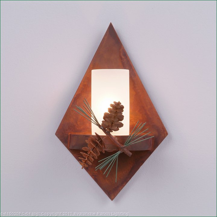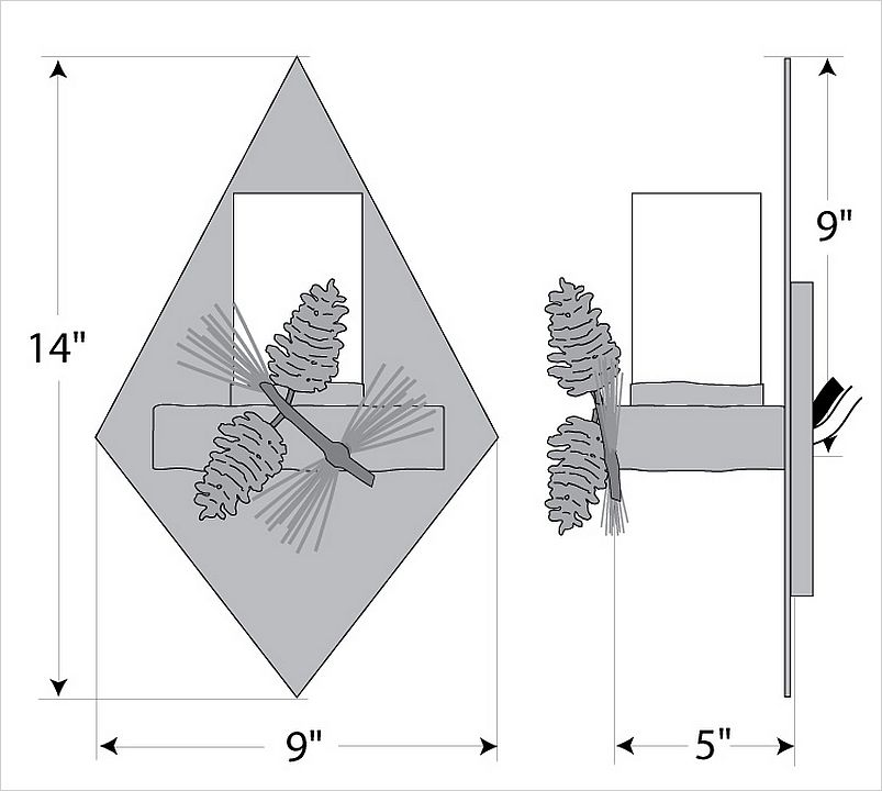 The Wisley Diamond Sconce Pine Cone features hand-made steel pine cones with pine needles on a lifelike metal branch. A diamond backplate and a 5 inch high by 3 inch diameter cylinder glass covers a candelabra bulb. The glass is available in either frost clear or tea stain. This sconce is ideal for anyone looking to incorporate stylish rustic contemporary lighting in their log home, cabin or northwood lodge-themed room.
