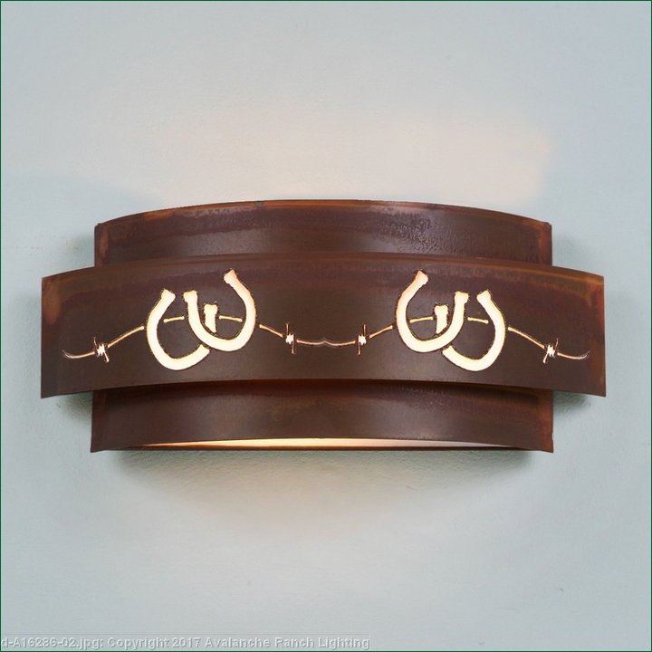 The Northridge Double Sconce - Barbed Wire/Horseshoe features two bulbs positioned sideways under a steel frame with laser-cut horseshoes and barbed wire images in the center band. It has a frost glass diffuser bottom and light projects both up and down. Synthetic mica is attached behind each image cutout to help diffuse the light. This Western-inspired sconce is really great for the hallways and will provide a warm accent to the walls of your home.