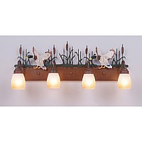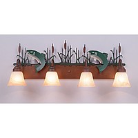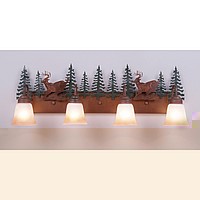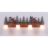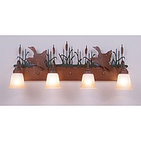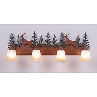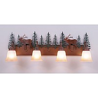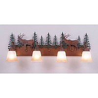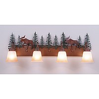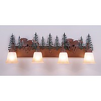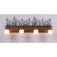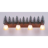 The Wasatch Bath Vanity Series is our best selling rustic bath fixtures. This Quad Bath Vanity Light is 36 inches wide and the four glass globes are offered with a choice of 8 different colors/styles. With it's rating of 100 W bulbs, this rustic bath light will really provide abundant light to any rustic bathroom.