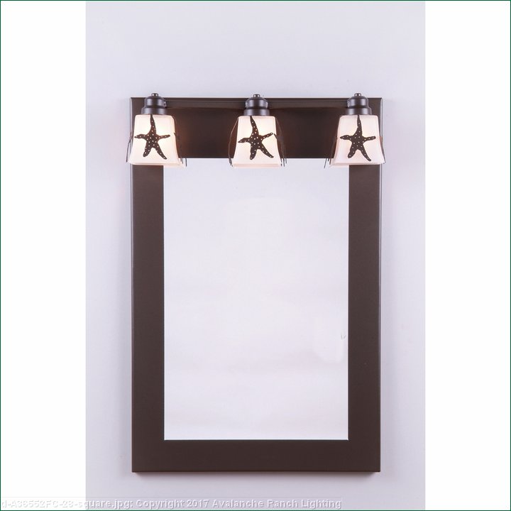 The Woodland Mirror Frame with Lights - Starfish features two pieces of square mission style glass, a mirror frame and starfish designs surrounding the glass. The Starfish have hand-cut interior dots which gives each image a unique look. Choice of glass color between Frost Clear and Tea-Stained. The lighting provided by this item allows the mirror to be hung in even the dimmest areas of any home or beach cabin, while also creating a stylish rustic contemporary atmosphere.
