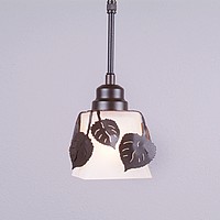 The Woodland Pendant Single Series is 5 inches wide and features leaves and other images surrounding a single piece of square mission style glass. Those lights with maple, oak or aspen leafs have hand-cut interior lines which gives each leaf a unique look. The spruce cone version has three-dimensional cone in the front and back. The glass is offered in two color choices: Frosted and Tea-stained. Includes a ceiling canopy in matching finish that can be mounted on either a flat or vaulted ceiling. Choice of three ways to hang our pendants: 14 ft black cord (BC), 15 inch - 30in adjustable stem (ST) or 3 ft chain (CH). This pendant series can be used outdoor with the adjustable stem and a powder-coated finish. This rustic contemporary pendant light is a sophisticated take on traditional rustic lighting.