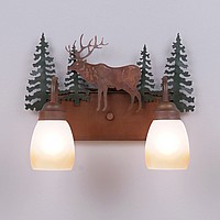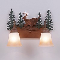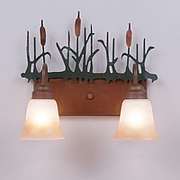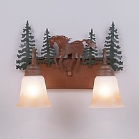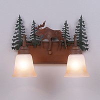 The Wasatch Bath Vanity Series is our best selling rustic bath fixtures. This Double Bath Vanity Light is 16 inches wide and the two glass globes are offered with a choice of 8 different colors/styles. With it's rating of 100 W bulbs, this rustic bath light will really provide abundant light to any rustic bathroom.