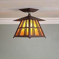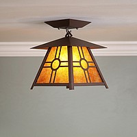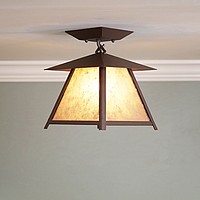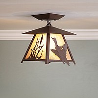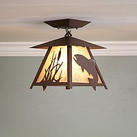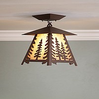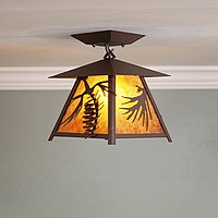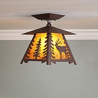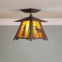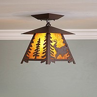 The Smoky Mtn Close-to-Ceiling Light Small series is 8 inches wide and 10 inches tall and features our exclusive artwork panels on all four sides in a steel frame. Diffuser material choices includes Almond or Amber mica, or, for an additional charge, you can order the acrylic material which is offered in three colors: Amber, Beige or White. These rustic ceiling lights are ideal for bringing rustic character to any log home, cabin or northwoods lodge-themed room.